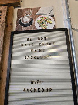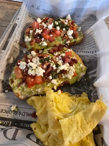 On Monday morning, I headed out for an early breakfast before my flight home, and had a cozy experience at Jacked Up Coffee Bar. I ordered the peppermint bark mocha from the December specials menu, and loaded avocado toast. The addition of eggs to the avocado toast was an optional add-on, and I went for it, making sure I had all of my macronutrients covered. With Fleetwood Mac playing over the speakers, and my plate loaded with two generous servings of avocado toast, I was one content elder Millennial. The avocado toast arrived atop wax paper that was printed to look like newspaper, and when I texted my husband a photo of my breakfast, he replied in jest, "Wrapped in recycled newspaper... how sustainable of you."