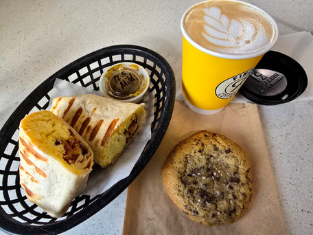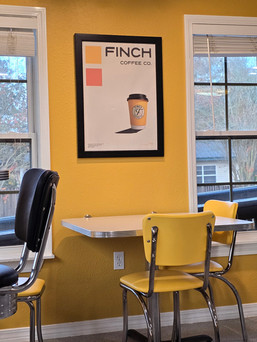 Vicki had signed up to run the Hippie Fish 5K on Saturday morning, and we made a plan to meet up afterwards for bagels. While I waited, I decided to grab a coffee and breakfast burrito at Finch Coffee since I was ready to start my day at 6:00 A.M. Finch is a small business with both a physical brick and mortar shop, and an adorable tiny coffee trailer. This beloved little coffee shop, founded by Brent and Amber Finch, has humble beginnings, starting out as just the mobile coffee trailer and eventually expanding into the brick and mortar space. Of course, I love taking every opportunity to support as many small businesses as I can during my trips, especially if I can get my coffee fix at the same time. The brick and mortar space is vibrant and welcoming, decked out top to bottom in vibrant yellow and cheerful decor that pairs well with a morning jolt of caffeine.