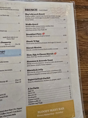 After spending some time at the finish festival, Vicki and I made the windy trek back across the stadium to the exit to head back to our hotels. One warm shower and fresh change of clothes later, I made my way to Ocean Springs to The Lady May for a big post-race brunch. It was closer to noon by this time, and I hoped the wait for a table wouldn't be too long. The Lady May is a favorite among locals, best known for their legendary homecooked Sunday brunch, and custom homemade products in their storefront gift shop, including tallow-based cooking oils, skincare remedies, and soaps. The restaurant's original owners and founders, Will Taylor and Chris McDonald, pay homage to the legacy of both of their grandmothers' recipes with their menu that is a blend of Italian Catholic and Southern cuisine.