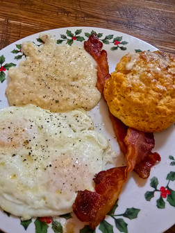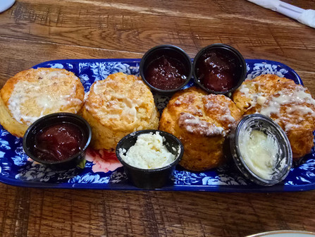Unsurprisingly, given the popularity of The Lady May as a must-visit tourist spot and a local staple, I waited about 40 minutes for a table. It was worth the wait, and I would have waited even longer if I had known ahead of time how incredible the biscuits would be. I ordered the breakfast plate, which included cheesy grits, a biscuit with honey butter, two slices of bacon, and eggs, and because I knew I would still be hungry, I also ordered a Belgian waffle on the side, which came with honey butter and syrup. Everything was great of course, but the biscuit stole the show. Lady May's biscuits are seriously some of the best you could ever have on the Mississippi side of the Mississippi. Vicki joined me soon after I got a table, and she ordered a whole order of biscuits, after I raved about the one on my plate.