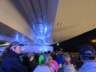 I was appreciative of the opportunity to see the lighthouse up close on the course, and it was a timely reminder of resilience at a time when I was beginning to need all the encouragement possible during the back half of the race. When we reached the exit ramp to I-110 just before mile 12, we experienced the less than desirable incline and banking of the ramp, the wind picked up to 22 - 30 mph, and I could feel the bone-chilling 10 degree temperature drop almost immediately. The incline and relentless headwind continued until we reached the turnaround point on the ramp, and we were then treated to a very pleasant downhill, ushered with ease to the finish by gravity and the wind at our backs.