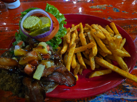 With tired legs and a very full stomach, I went back to my hotel and passed out almost right away, and I ended up taking a 3-hour nap. Typically I don't need to take a nap after a race, and I usually have energy left over to explore the area I'm visiting, but the extra exertion of running against the wind must have taken more of a toll on me than I expected. Next thing I knew, it was almost 6 P.M., and time to eat again. Shaggy's was only a short distance from my hotel, and was on my list of places to visit based on all of the positive Google reviews. There was also nothing I craved more than a giant burger loaded with all sorts of produce and vegetation. Especially pineapple. I ordered the Big Kahuna Burger, and while I waited, I became interested in the story of Shaggy's, which was displayed on the back of the menu.
