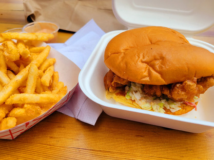 We spent the next four hours at Gather GVL, where Chris introduced me to three of his awesome long-time friends — Allison, "Lids," and Faith — who made me feel like family by the end of the day. Gather GVL, which is praised on their website as "the 6th Best Food Hall in America according to the 2023 USA Today Readers’ Choice Awards," is the heartbeat of Greenville's West End, and is a vibrant outdoor food court constructed entirely of shipping containers. Each shipping container features a different local business, and the options span from burgers and pizza to international cuisine to beverage vendors. I ordered a Southern sandwich from HenDough, which was fried chicken sandwich with coleslaw and pimento cheese, plus fries, and within minutes it was all gone.